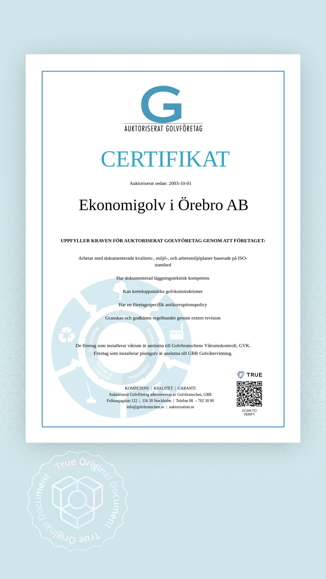 Detta dokument visar att företaget är ett Auktoriserat Golvföretag.